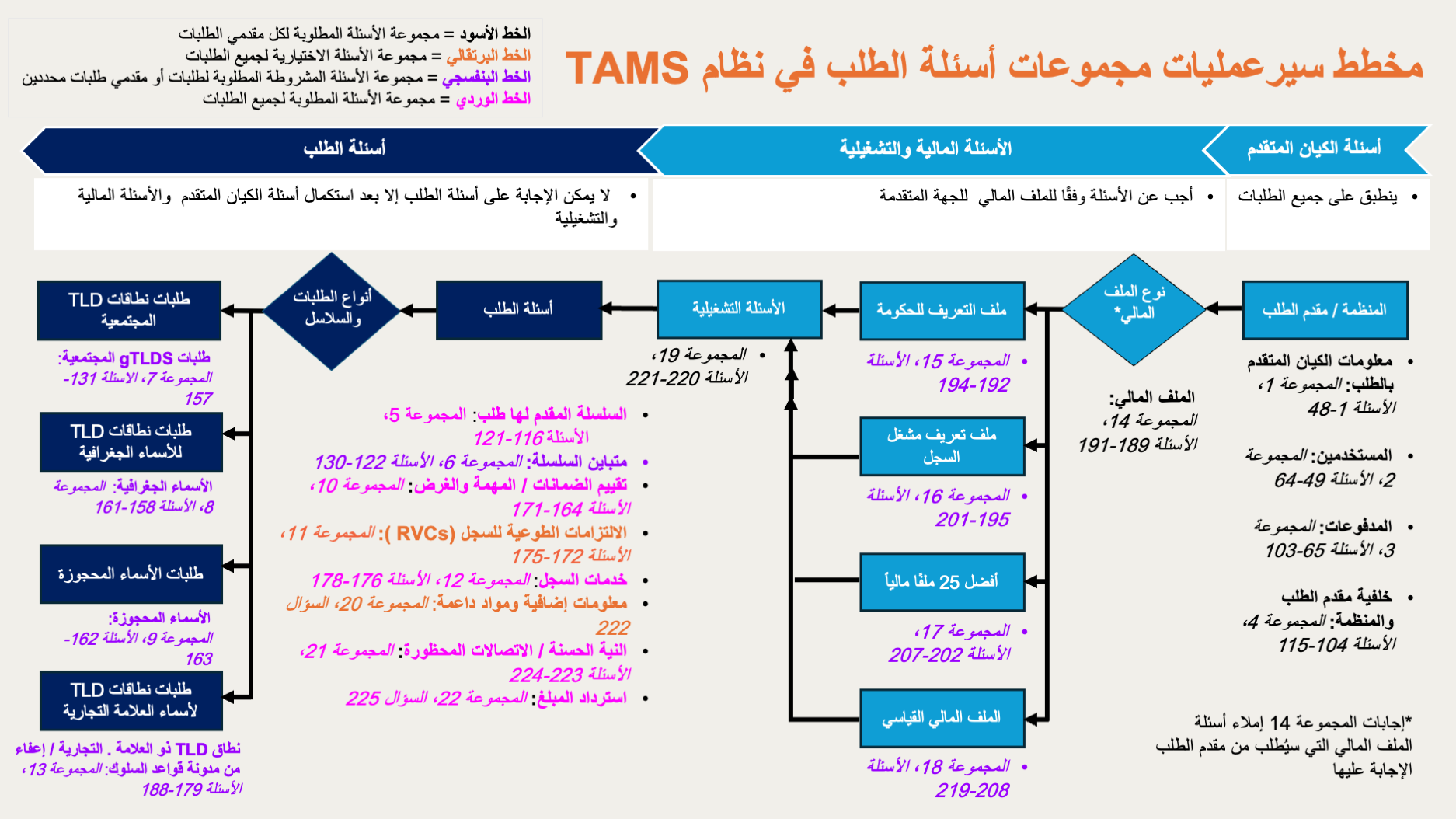 | المجموعة | محور الأسئلة | رقم القسم واسمه الخاص بنظام TAMS | الغرض | تنطبق على |