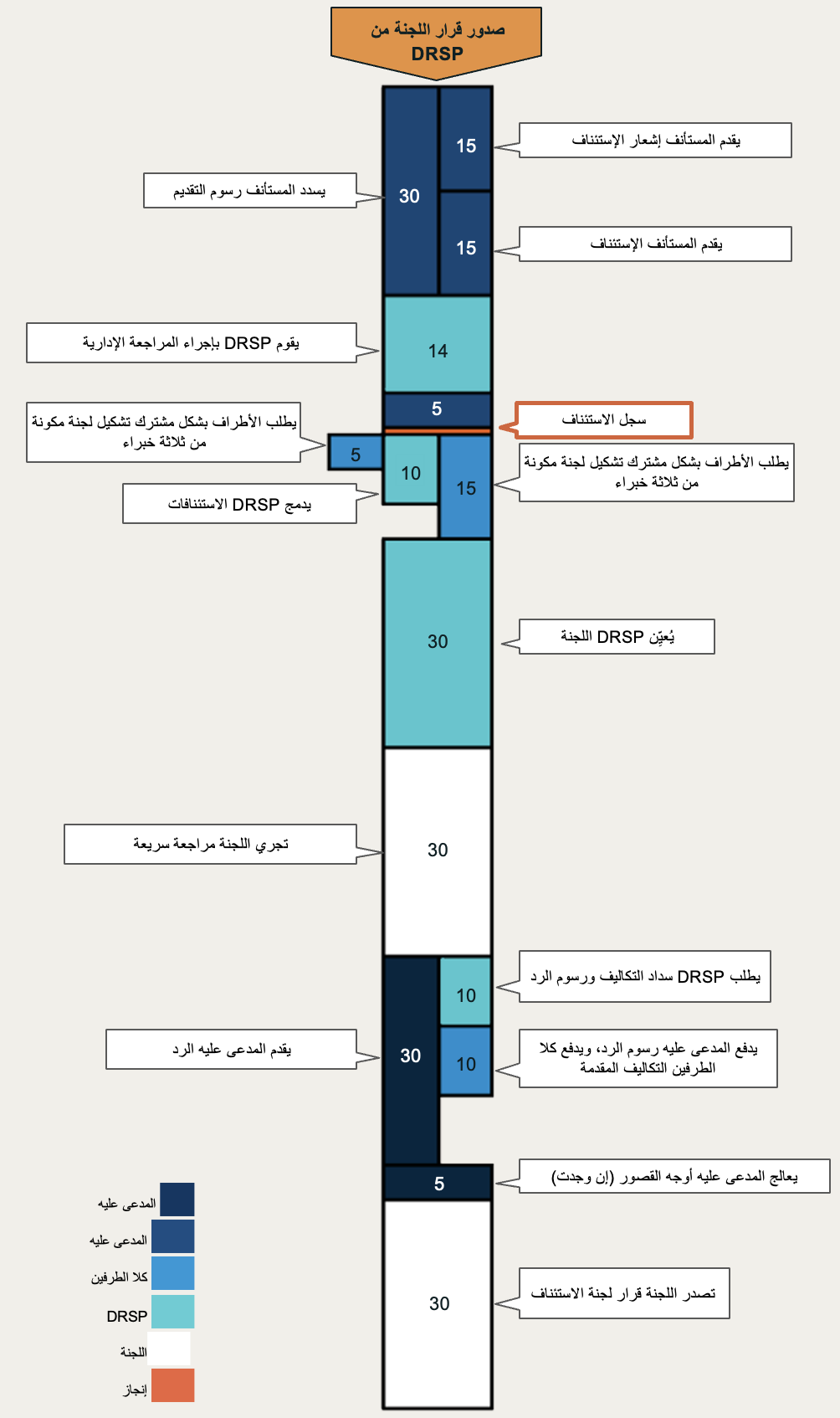 ويجب على نظام تسوية المنازعات (DRSP) ولجنة الاستئناف بذل جهود معقولة لضمان إصدار قرار لجنة الاستئناف خلال 35 يومًا من الموعد النهائي لتقديم الرد. وفي ظروف محددة مثل الحالات الموحدة وبعد التشاور مع مزوّد خدمة تسوية الخلافات DRSP، قد يُسمح بتمديد قصير.