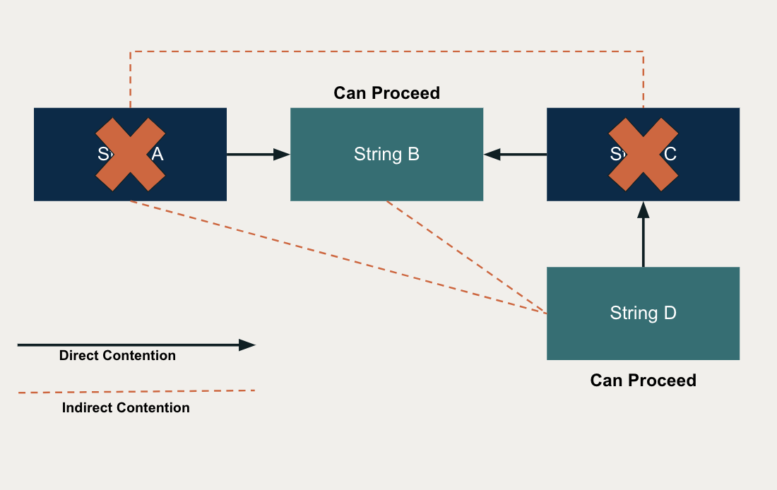 Figure 5-2 provides a simple example of direct and indirect contention. In Figure 5-2, Strings A and B are in direct contention and Strings B and C are in direct contention, whereas Strings C and A are in indirect contention. That is, strings C and A both contend with String B, but not with one another. In the same figure, while Strings B and C are in direct contention, String C is also in contention with String D. Strings A and D are therefore also in indirect contention as are Strings B and D.