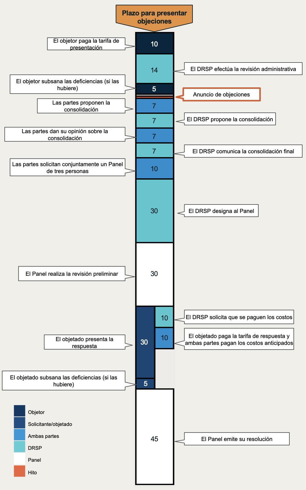 El DRSP podrá optar por proponer la consolidación de determinadas Objeciones en un plazo de 14 días a partir de la publicación del Anuncio de objeciones, sopesando los beneficios (en términos de tiempo, costo, coherencia de las decisiones, etc.) que puedan resultar de la consolidación frente a los posibles perjuicios o inconvenientes que la consolidación pueda causar.