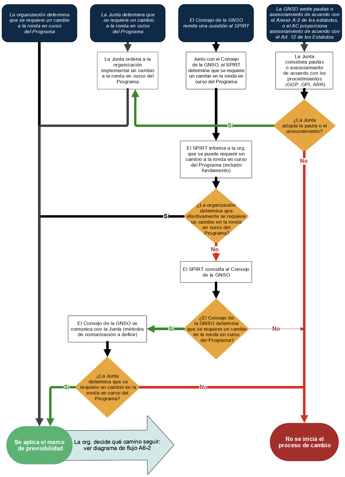 Vía 2: La Junta Directiva de la ICANN determina que es necesario un cambio en la ronda en curso del Programa. La Junta Directiva de la ICANN ordena a la organización de la ICANN que implemente el cambio. Si la implementación requiere un cambio en la ronda en curso del Programa, la organización de la ICANN aplica el Marco de Previsibilidad y procede con los pasos descritos en el diagrama de flujo de ejecución de cambios.