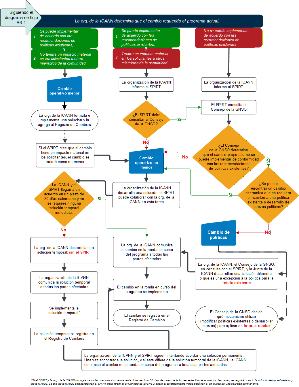 Un cambio operativo no menor se refiere a un cambio durante la ronda en curso del Programa que puede implementarse de acuerdo con las recomendaciones en materia de políticas existentes aprobadas por la Junta Directiva y tiene un impacto material en los solicitantes.6 La organización de la ICANN y el SPIRT deben acordar una solución permanente. Si no se llega a un acuerdo en un plazo de 30 días, o si es necesario adoptar medidas más urgentes para el funcionamiento del programa, la ICANN podrá implementar una solución temporal que será sustituida por la solución acordada entre la ICANN y el SPIRT una vez que se haya alcanzado un acuerdo.