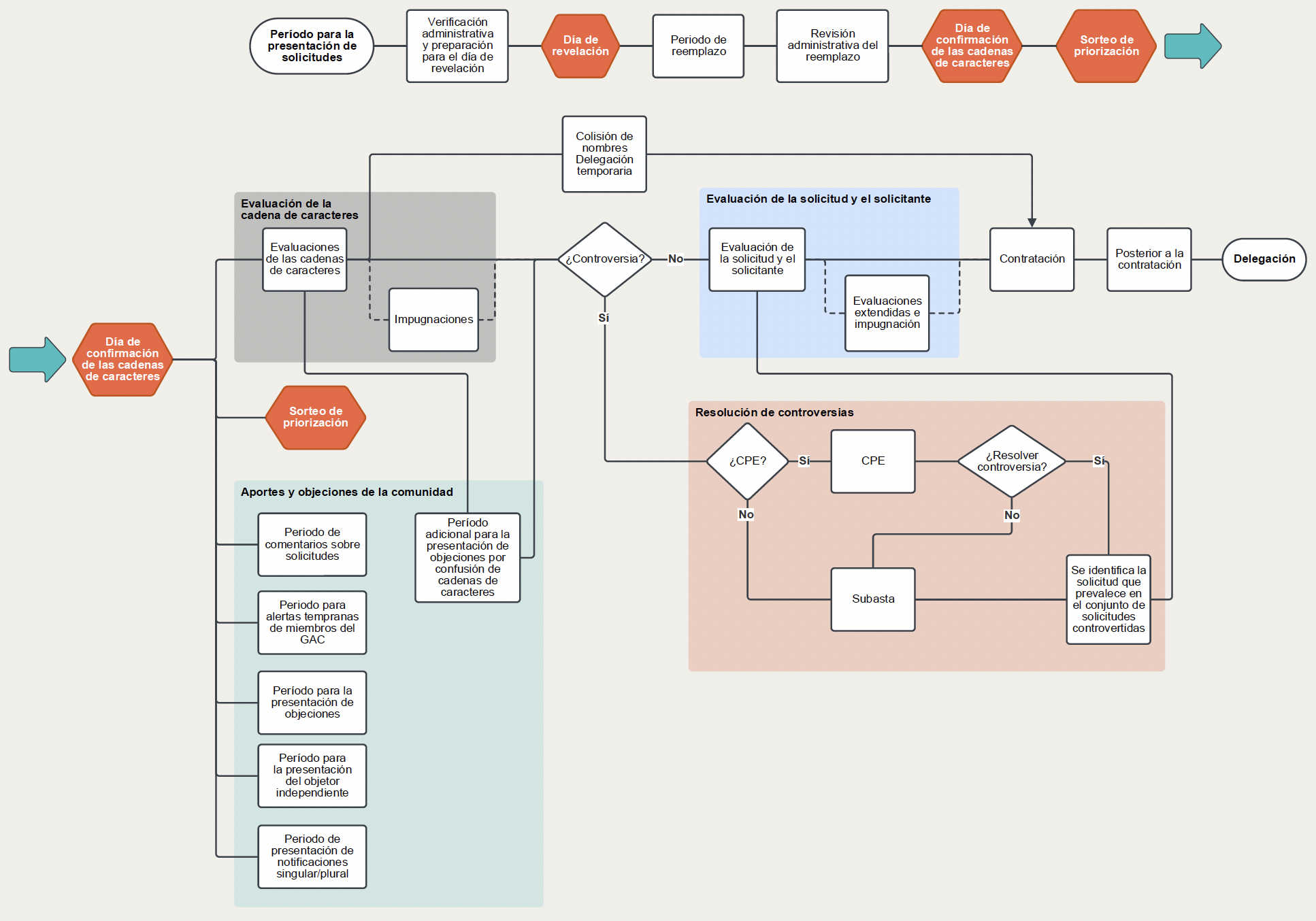 Esta sección describe las etapas por las que pasa una solicitud durante el período de presentación de solicitudes y una vez presentada. Mientras que algunas etapas se aplican a todas las solicitudes presentadas, otras ocurren solo en circunstancias específicas. Esta sección ofrece una reseña general y no exhaustiva de los diversos procesos. Para obtener información completa, los solicitantes y otras partes interesadas deben consultar las secciones pertinentes de la Guía para el Solicitante.