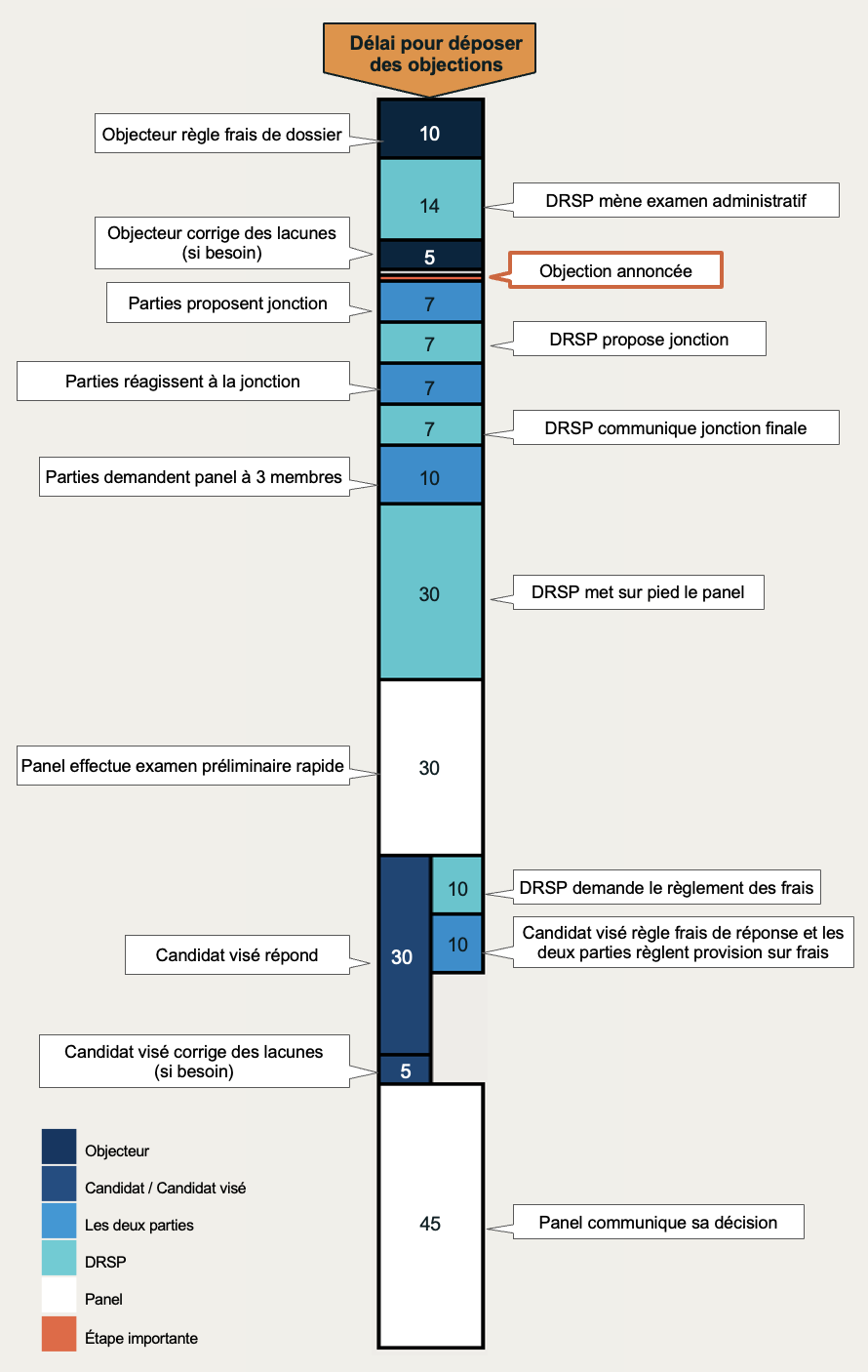 Remarque: Il s’agit d’aperçus simplifiés indiquant le nombre maximal de jours que chaque processus devrait durer, hors circonstances extraordinaires. Les délais réels sont susceptibles de changer en fonction d’un certain nombre de facteurs, notamment, mais sans s’y limiter, les cas particulièrement complexes et les demandes de délais de réflexion et d’audiences virtuelles.