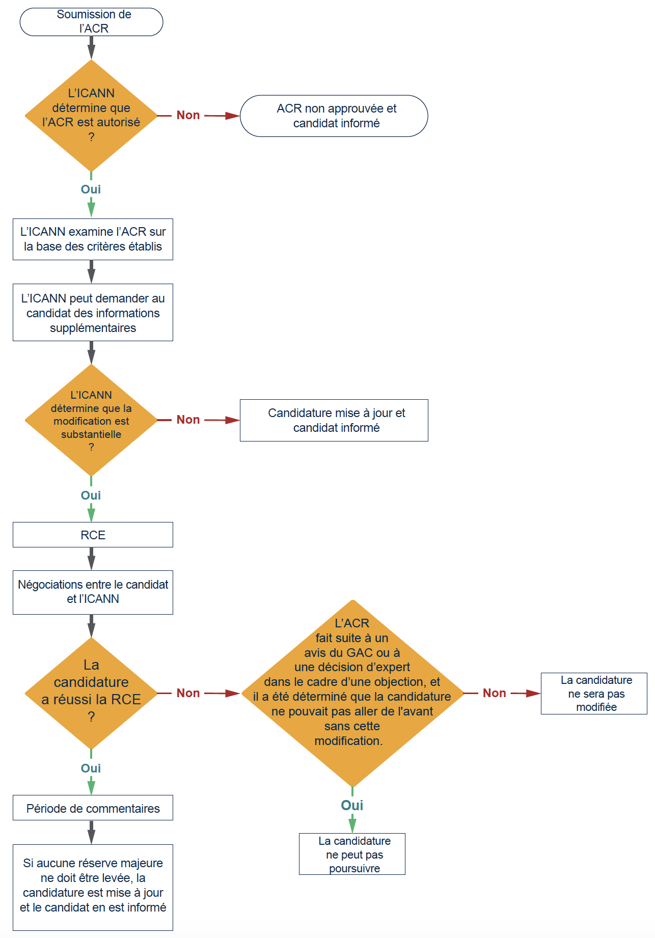 Nouveau RVC ou RVC modifié : le candidat dépose une ACR qui porte sur l’ajout ou la modification d’un RVC, afin de répondre à l’avis de consensus du GAC. Si l’ACR est acceptée et que l’évaluation de l’engagement de l’opérateur de registre est concluante, le Conseil d’administration tiendra compte de cet engagement nouveau ou modifié. Il appartiendra alors au Conseil d’administration de déterminer s’il y a lieu de donner suite à la préoccupation exprimée dans l’avis de consensus du GAC, ou si ledit RVC y répond de manière satisfaisante.