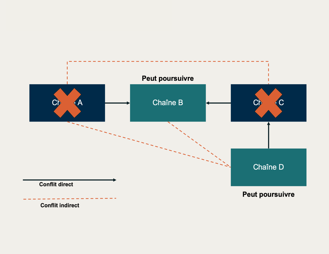 La Figure 5-2 montre un exemple de confit direct et indirect. Dans la Figure 5.2, les chaînes A et B sont en conflit direct, tout comme les chaînes B et C, alors que les chaînes C et A sont en conflit indirect. Cela veut dire que les chaînes C et A sont en conflit avec la chaîne B, mais pas l’une avec l’autre. Sur cette même figure, outre le conflit direct entre B et C, la chaîne C est également en conflit avec la chaîne D. Par conséquent, A et D se retrouvent aussi en conflit indirect, tout comme B et D.