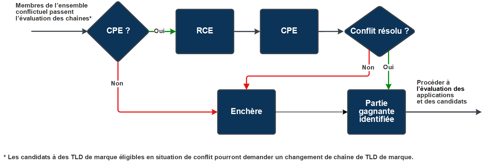 Des ensembles conflictuels peuvent se former, évoluer et être résolus tout au long de la procédure, au gré des processus décrits dans la Section 5.3.4 Formation des ensembles conflictuels. Seuls les candidats admissibles à un TLD de marque ont la possibilité de soumettre une demande de changement de chaîne de TLD de marque pour se soustraire à un conflit (et, par là même, aux procédures de résolution). Se reporter à la Section 5.3 Demandes de changement de chaîne de TLD de marque.