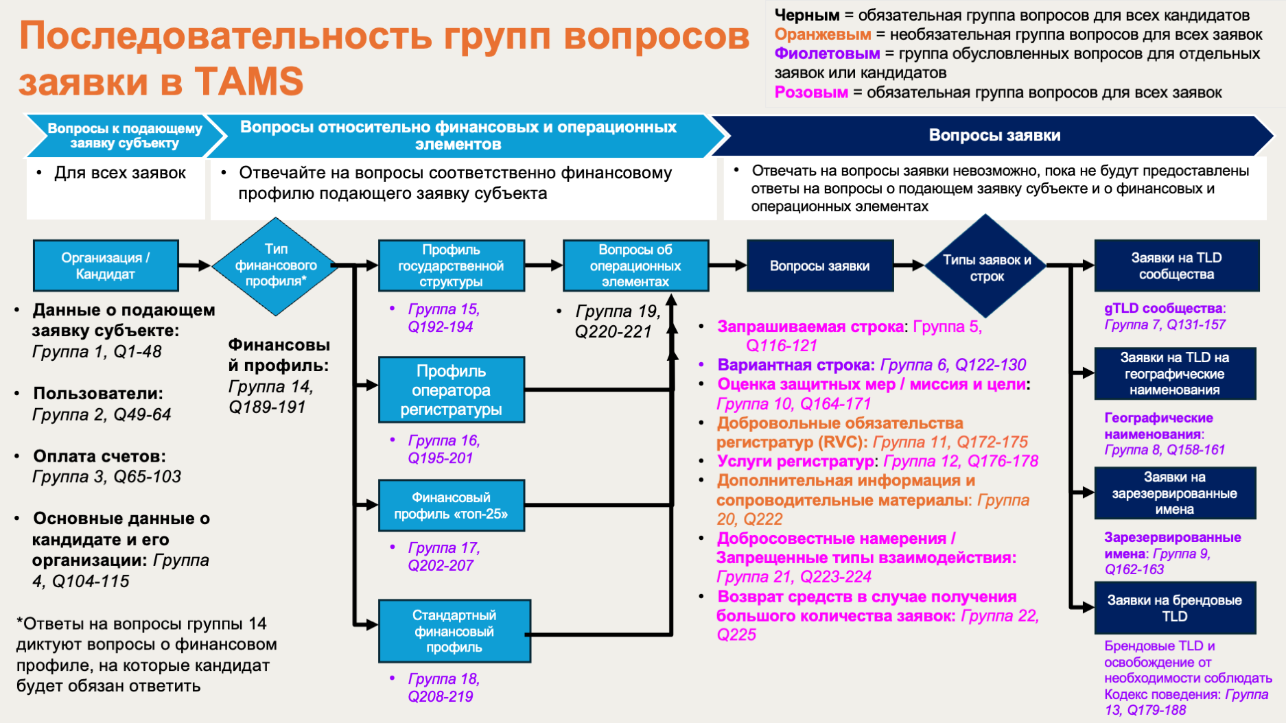 | 1 | Данные о подающем заявку субъекте3 | TAMS.0. Данные об организации кандидата | Эта группа вопросов предназначена для сбора информации о юридическом лице, которое подпишет Соглашение об администрировании домена верхнего уровня с ICANN после успешного прохождения всех соответствующих процессов рассмотрения заявки. Информация собирается для проверки основных данных. | Все типы подающих заявку субъектов и заявок |