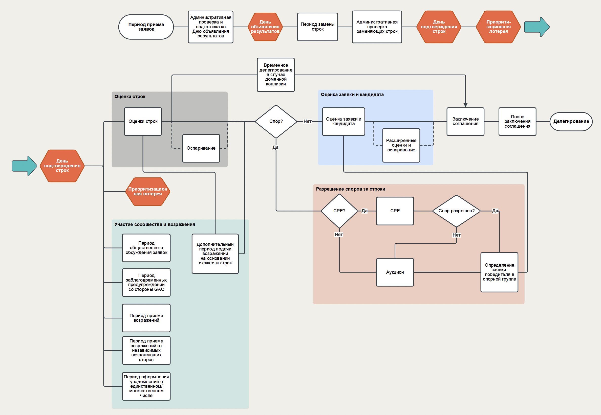 Претензии, выдвигаемые после этого момента, не будут приняты на рассмотрение, поэтому кандидатам рекомендуется начинать подачу заявок максимально рано и инициировать процедуры оспаривания не позднее, чем за 14 дней до окончания периода приема заявок. Это относится к идентификации заблокированных имен, идентификации зарезервированных имен и проверке стабильности DNS.↩︎