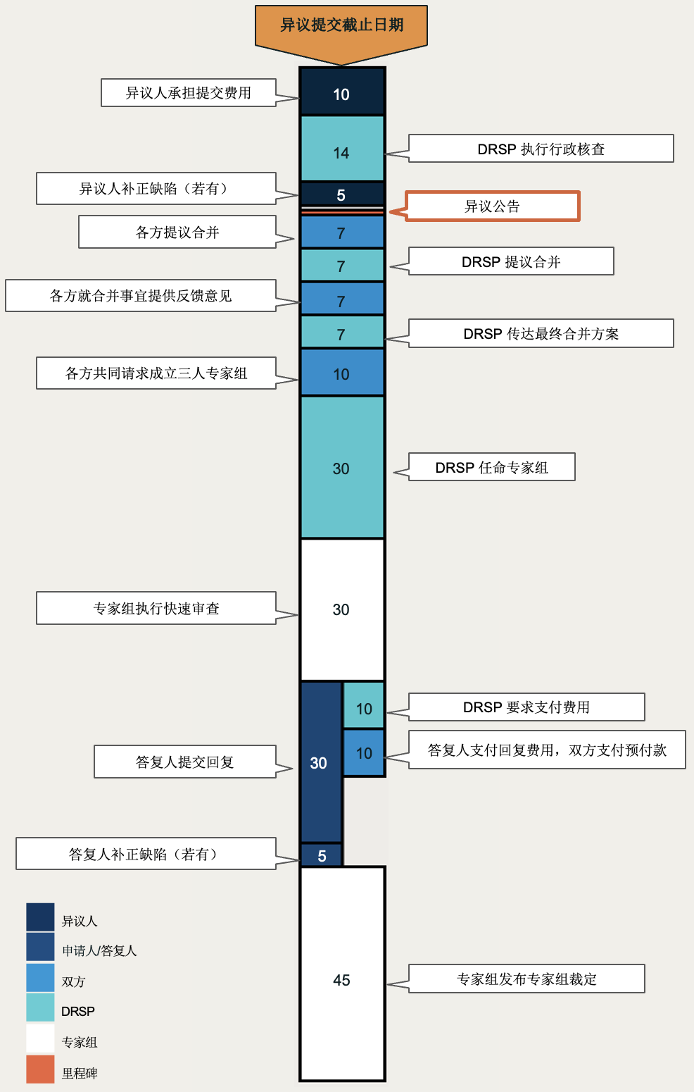 DRSP 可在其裁量权范围内,于异议公告发布后 14 日内酌情提议合并处理特定异议,权衡合并可能带来的益处(包括时间、成本、决策一致性等方面)与合并可能造成的损害或不便。