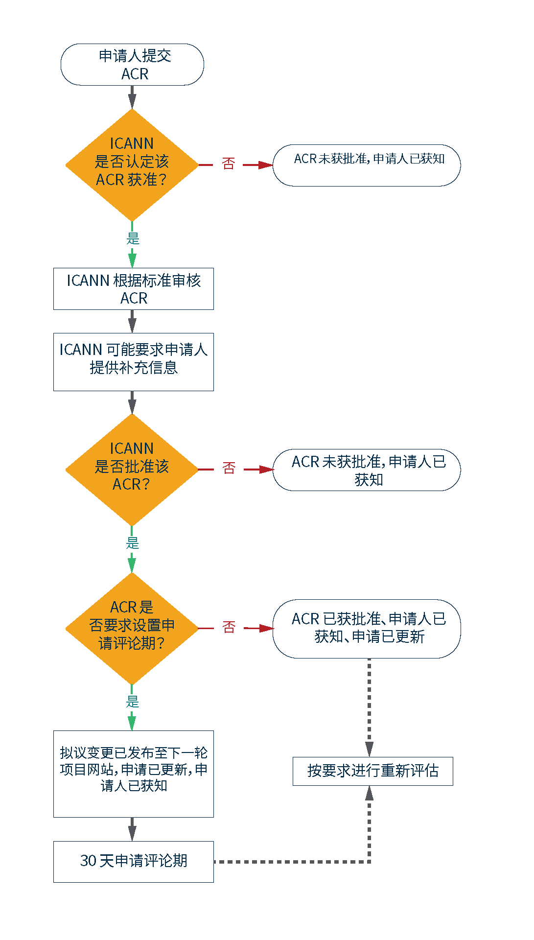 如果 ACR 获得批准,ICANN 将把拟议变更发布到新 gTLD 项目网站,更新申请,并通知申请人。此外,ICANN 还将告知申请人以下结果之一: